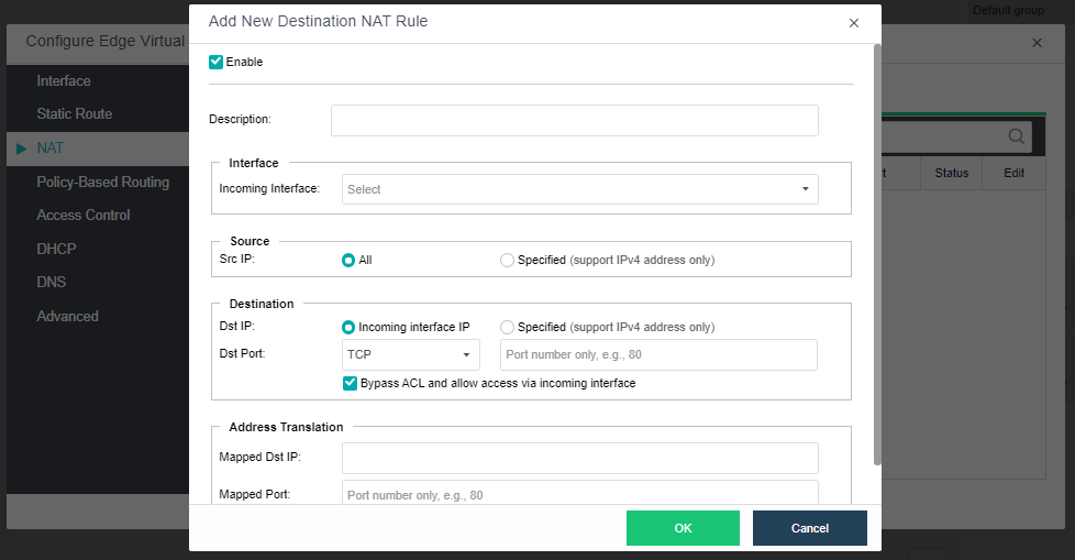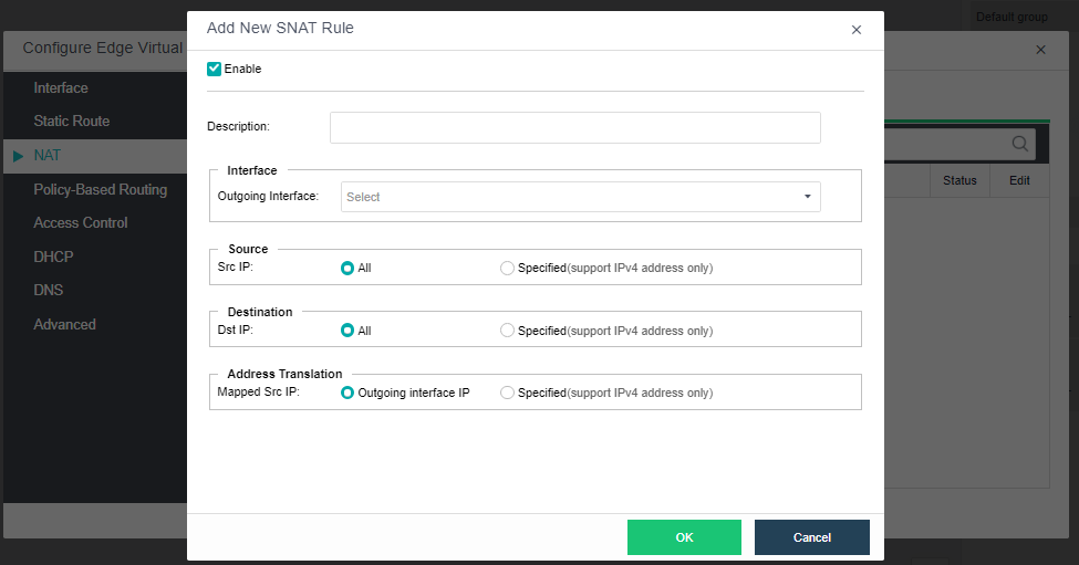 Click New under the Source NAT tab to configure SNAT, and click New under the Destination NAT tab to configure DNAT. Source address translation and destination address translation only support IPv4 addresses.