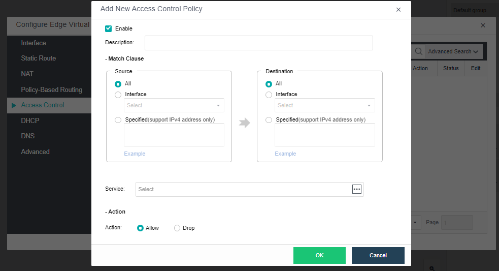 Under the Access Control tab, click New to configure an access control policy.