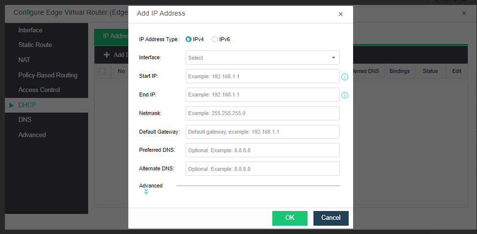Under the DHCP tab, click Add IP Address to configure the address range of the DHCP IP pool (both IPv4 and IPv6 are supported). You can view the currently assigned IPv4 address information in DHCPv4. In DHCPv6, you can view the currently assigned IPv6 address information.