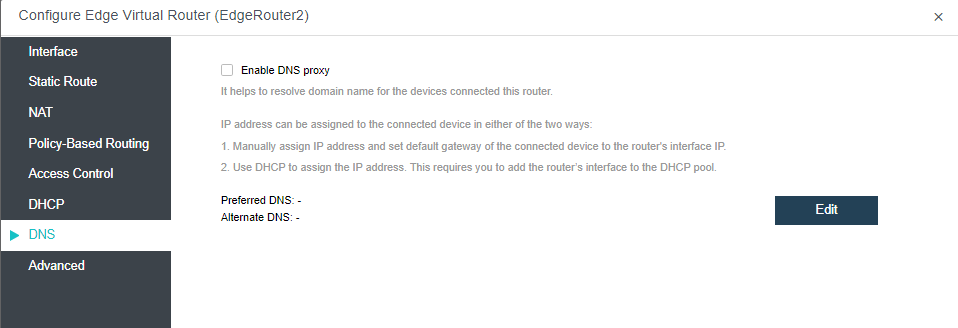 Under the DNS tab, check the Enable DNS proxy checkbox and click OK to configure the Preferred DNS and Alternate DNS.