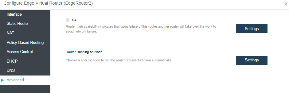 Under the Advanced tab, configure the HA and running location of the virtual router.