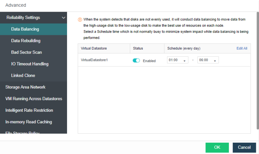 Suppose the remaining storage space is below a certain range. In that case, the data balancing task will be executed automatically to have VM files stored on the node short of resources moved to another node. Data that have been migrated will be evenly written into each disk to keep disk usage balanced.