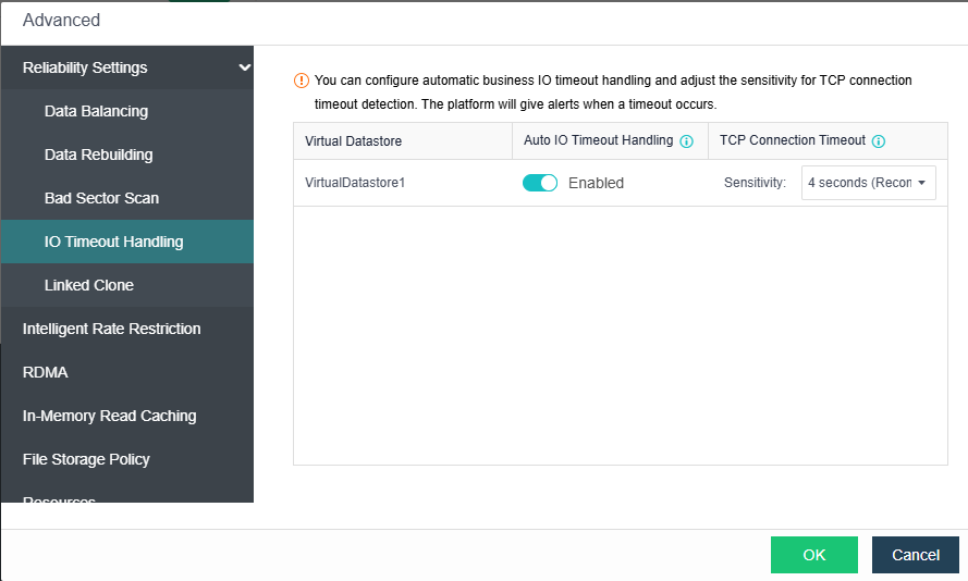 Go to Storage > Virtual Storage > Virtual Datastores > Advanced > Reliability Settings > IO Timeout Handling to specify the IO Read Latency Threshold for read request timeout handling and the Sensitivity of the TCP Connection Timeout of the storage node for write request timeout handling.
