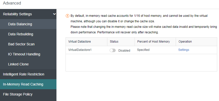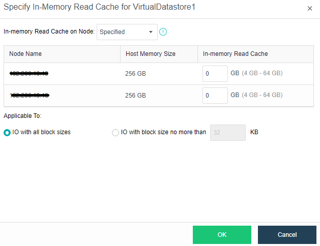 Go to In-Memory Read Caching and click Settings. And can choose whether this function takes effect for all IO block sizes or specific block sizes only.
