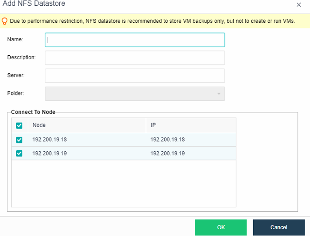 Configure the name of the NFS storage and the server IP, select the corresponding folder, select the node to be connected, and click OK.