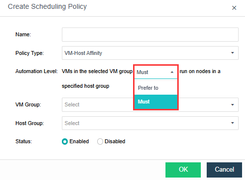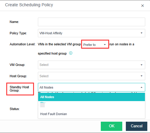 • If you select Prefer to for Automation Level, you can set a standby host group. In this case, if no host is available in the selected host group, VMs will be scheduled to hosts in the selected standby host group.