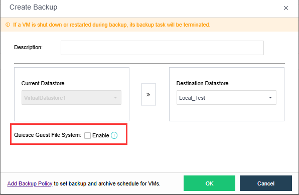 Open the Create Backup dialog box for the target VM and select Enable for Quiesce Guest File System. For details, see section 8.9.1.1 "Manual Backup."