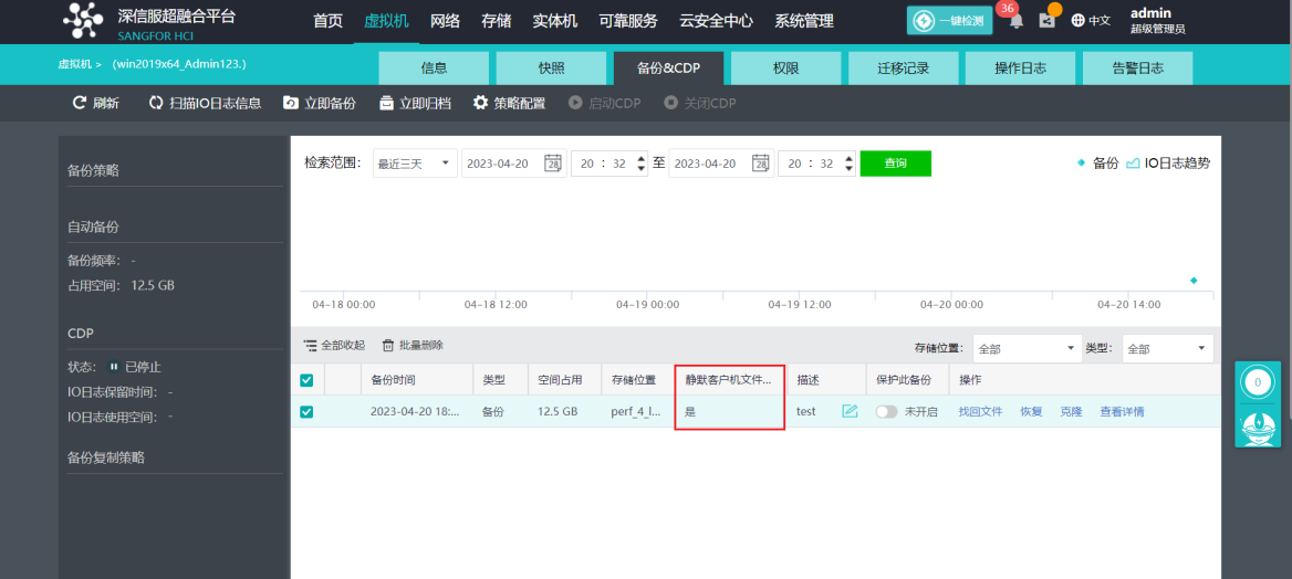 Go to Compute > List, click the drop-down arrow next to the target VM, and select Summary. Then, click the Backup/CDP tab and check whether a backup has been created in quiesced mode.