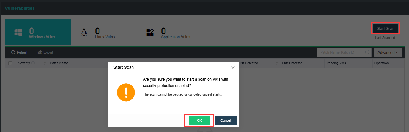 Go to aSecurity > Security Capabilities > Vulnerabilities. The platform automatically detects and reports Windows, Linux, and application vulnerabilities, and you can also manually scan for vulnerabilities.