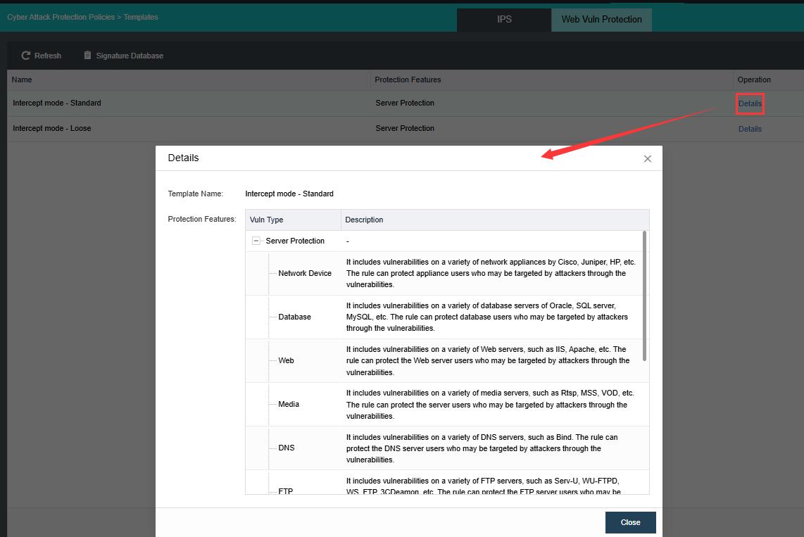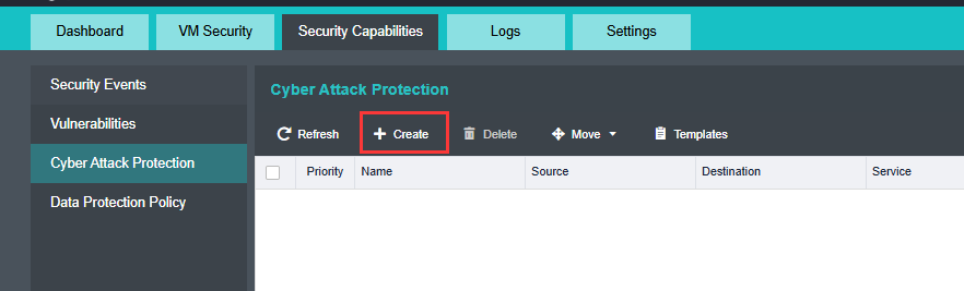 Go to Cyber Attack Protection Policies > Templates to view or manage intrusion prevention policies and web vulnerability policies.