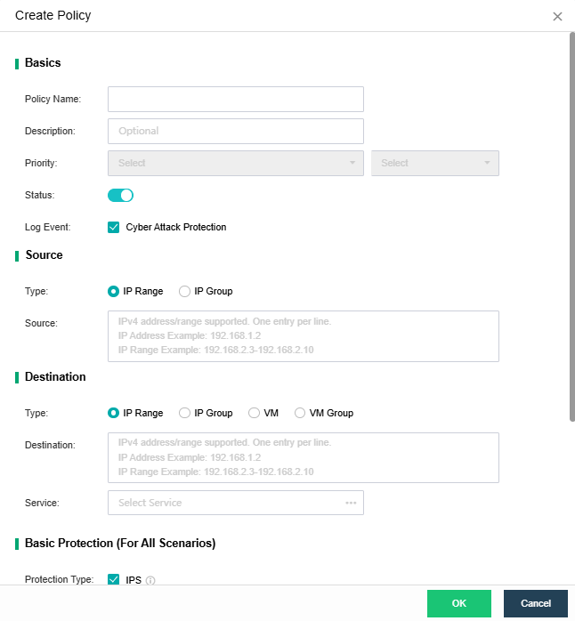 Go to aSecurity > Security Capabilities > Cyber Attack Protection, click Create, configure the basic, source, and destination information, and select applicable scenarios for the policy.