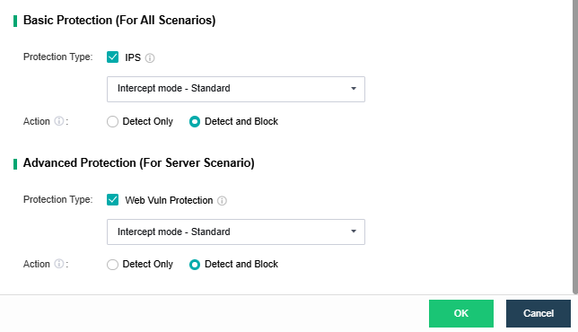 • Web Vuln Protection: Protects web servers from various attacks targeting web applications, such as SQL injections, XSS attacks, and command injections.