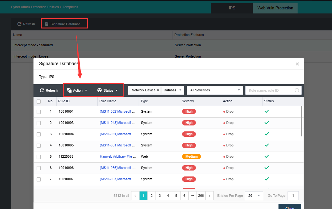 • Go to Signature Database and set Action (Allow or Drop) and Status (Enable or Disable).