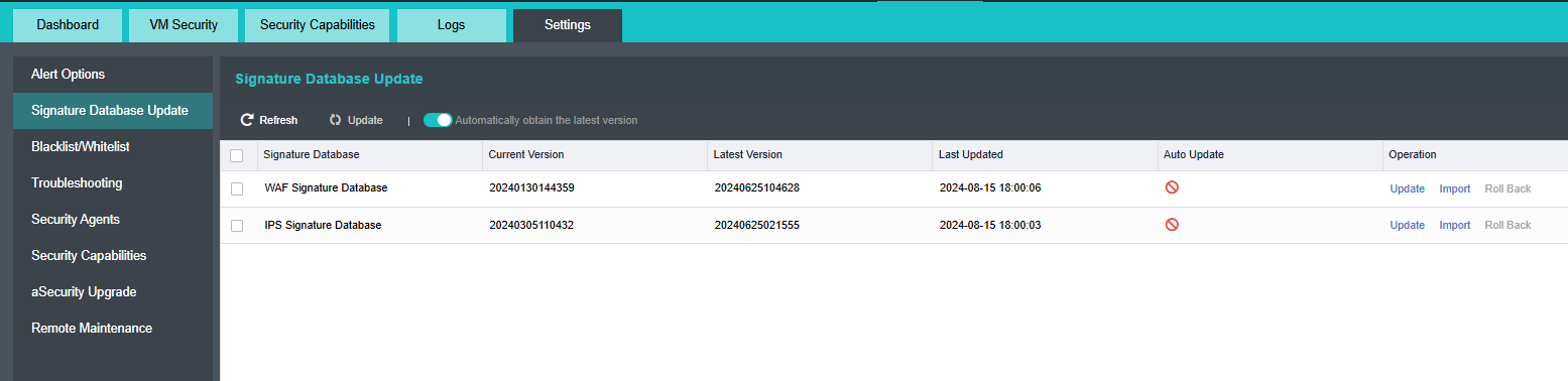 Go to aSecurity > SecuritySettings > Signature Database Update. On the page that appears, you can view the information of current signature databases, including Name, Current Version, Latest Version, and Update Time. You can perform operations such as online updates, manual import, and rollback.