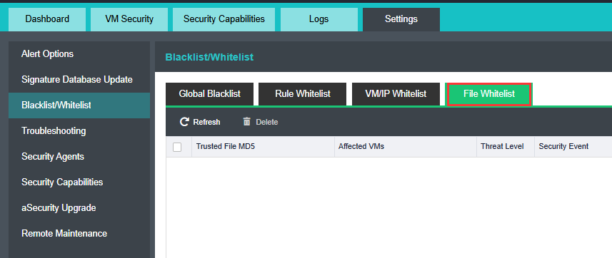 On the File Whitelist tab, remove trusted threat events as needed, which will also remove files with the same MD5 value.