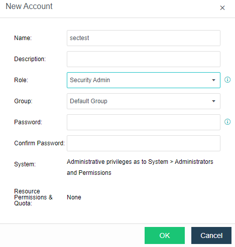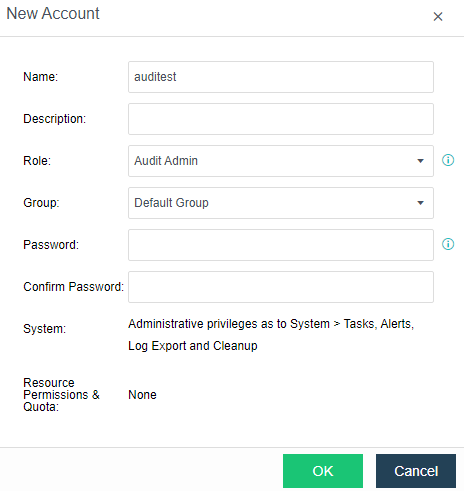 Click Add New Account to configure the name, description, group, password, and other information, select Audit Admin for the role, and then click OK.