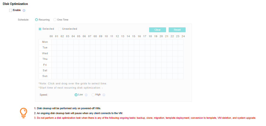 Do not perform a disk optimization task when there are any of the following ongoing tasks: backup, clone, migration, template deployment, conversion to template, VM deletion, and system upgrade. When a task conflict occurs, stop disk optimization.