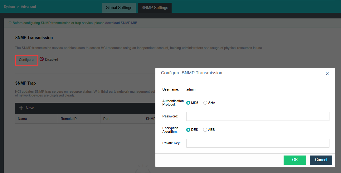 In the SNMP Transmission section, click Configure and set parameters to enable users to access HCI resources using an independent account, helping administrators understand the usage of physical resources in use. Select MD5 or SHA for Authentication Protocol and AES or DES for Encryption Algorithm.