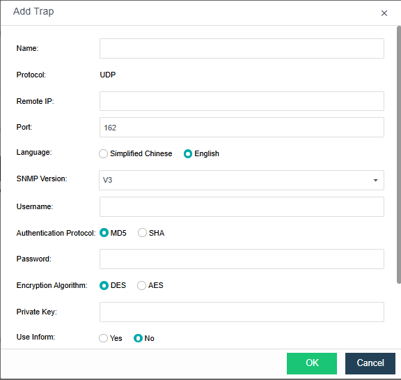 • Remote IP/Port: The IP addresses or ports cannot conflict with each other if multiple traps are configured. Port 162 is used by default.