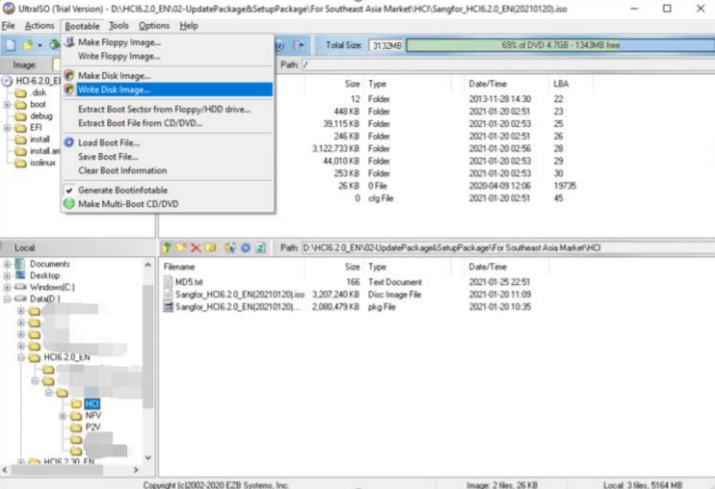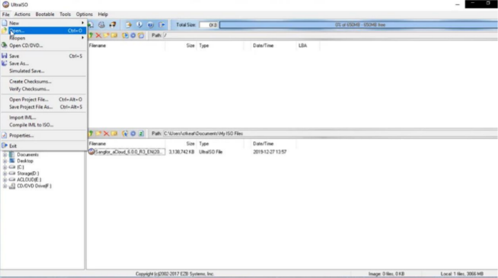 First, insert the USB flash disk into the personal PC, then open the software UltraISO, select File > Open, and load the ISO file of Sangfor HCI software from the local disk.