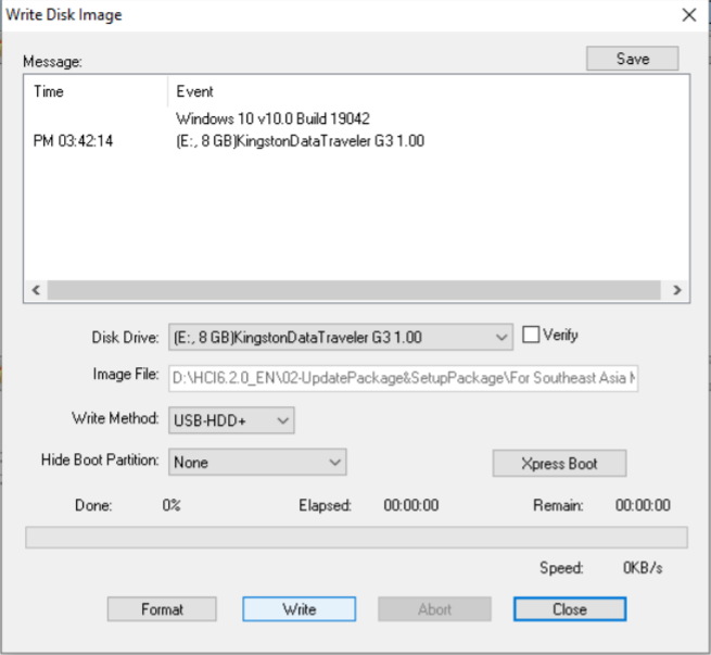 The writing format of the USB drive should be USB-HDD or USB-HDD+. Click Verify to check whether the image file is written correctly.