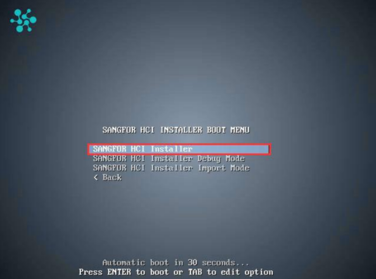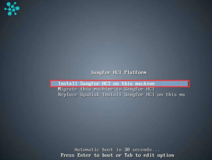 For installation from an ISO image, load the installer and choose to boot from IPMI. For installation from a USB flash drive, boot from the prepared flash drive. Then, the following page is displayed. Select Install Sangfor HCI on this machine and press Enter.