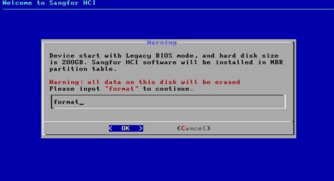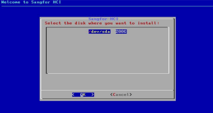 Select a disk where you want to install Sangfor HCI software and select OK.