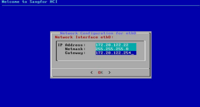 Configure the IP address, subnet mask, and gateway, and then click OK. Make sure that the address can communicate properly with the target HCI cluster.
