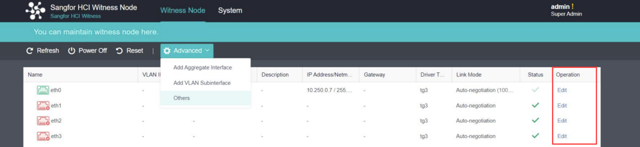 aServer-J-100Z comes with a preinstalled witness node operating system, with eth0 as the management interface and the default IP address of 10.250.0.7/24. To log in to the aServer-J-100Z console, configure an IP address on the same segment as the PC, connect to eth0, and visit https://10.250.0.7/ in your browser.