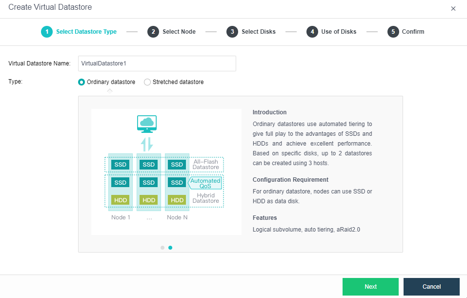 In a cluster adopting the deployment mode of 2 nodes and 1 witness node, you cannot create two datastores by disk (which is only available if there are at least three nodes).