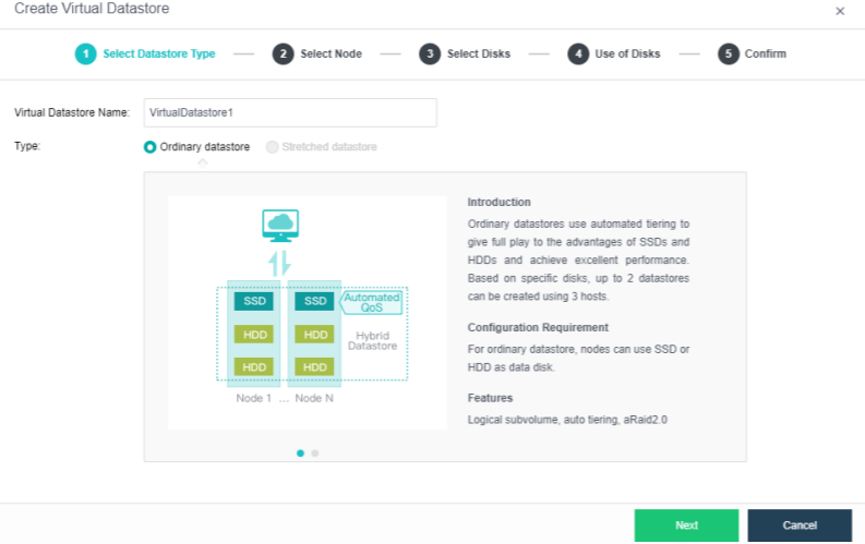 Navigate to Storage > Virtual Storage, click New, and select the volume type as Ordinary datastore.
