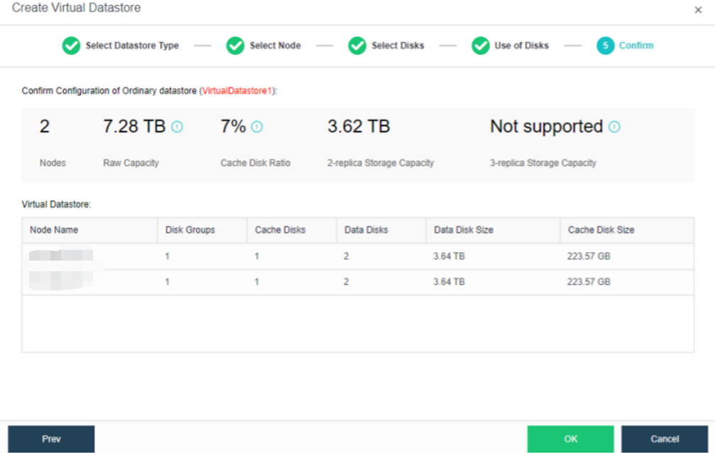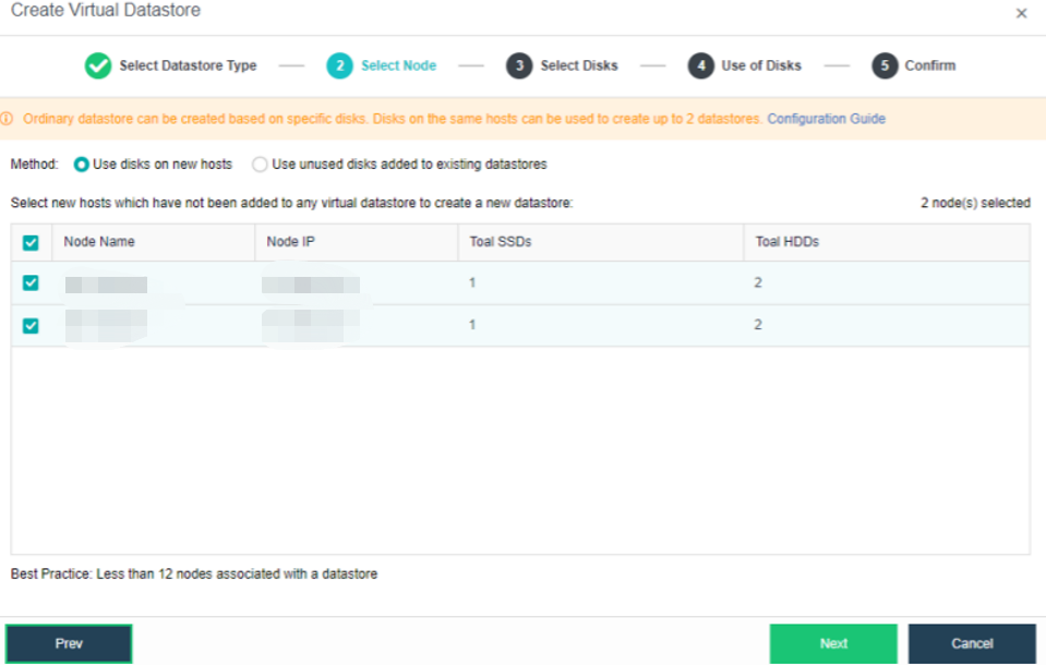 Select the corresponding method and nodes to create a virtual datastore. Since we are creating the first virtual datastore, choose the Use disks on new hosts. You can enable RDMA for nodes as needed. For the introduction of the RDMA feature and the precautions for enabling RDMA, refer toSection 3.5.2 Enable RDMA (Optional).
