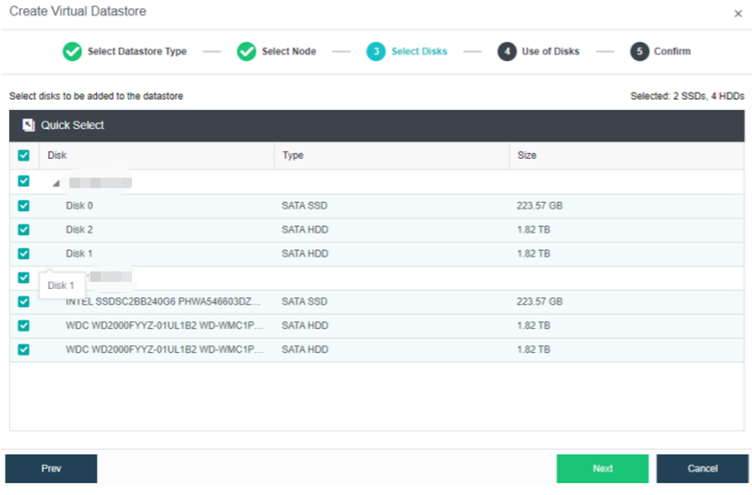 Select the disks that will be used to create a virtual datastore.
