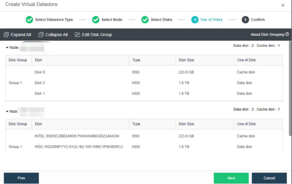 Select the hard disk to be added to the node. Configure hard disks and hard disk groups, and then make a detailed usage plan for each node's disk. The system will automatically detect the disks of all nodes in the cluster. By default, mechanical disks are selected as data disks and solid-state disks as cache disks. Using the default configuration is recommended. If you need to deploy multiple databases, you need to plan to reserve the disks of the second database group.