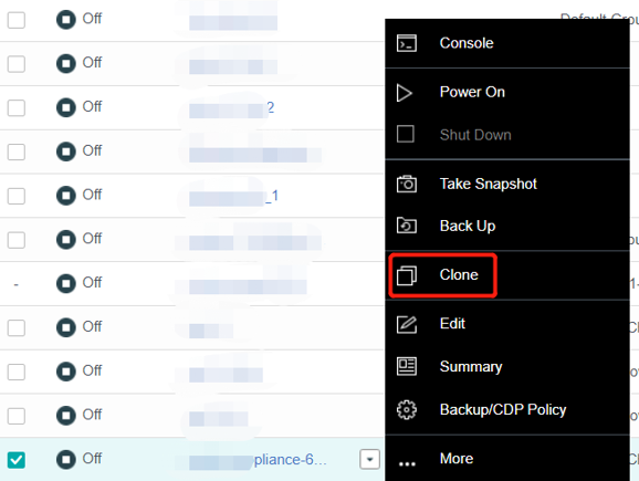 On the Compute page, place the mouse over the virtual machine to be cloned and click More > Clone.