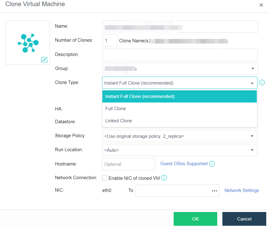 Select Full cloning as the clone type, and customize parameters such as virtual machine name, number of virtual machines to be cloned, grouping, ha, datastore, storage policy, running location, etc.