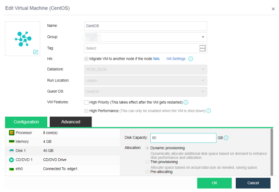 To expand the existing virtual machine disks and add new disks, please refer to Chapter 5.2.7 Virtual Machine Editing of this document.