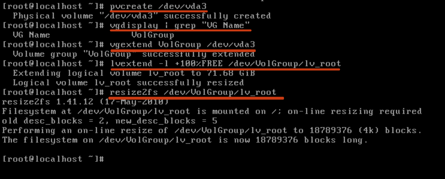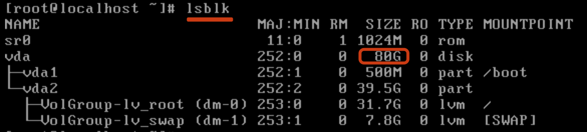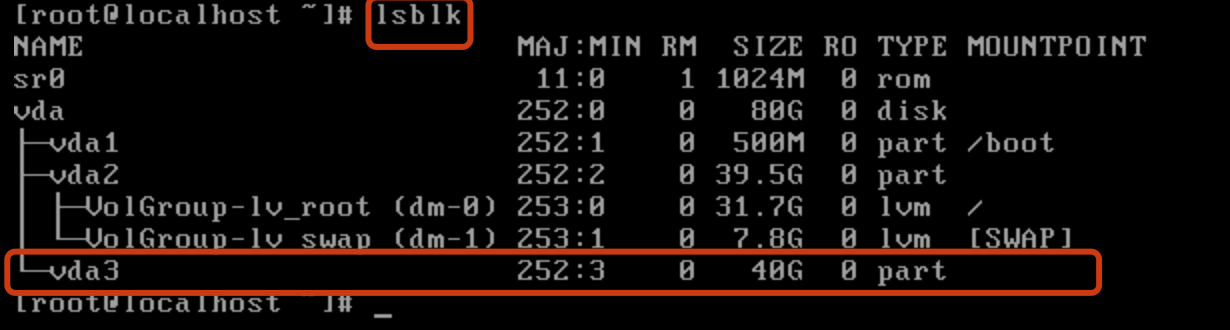 View current information: View the expanded disk information through the "lsblk" command. The disk is "/dev/vda", vg is "volgroup", and lv is "/dev/ volgroup/lv_root".