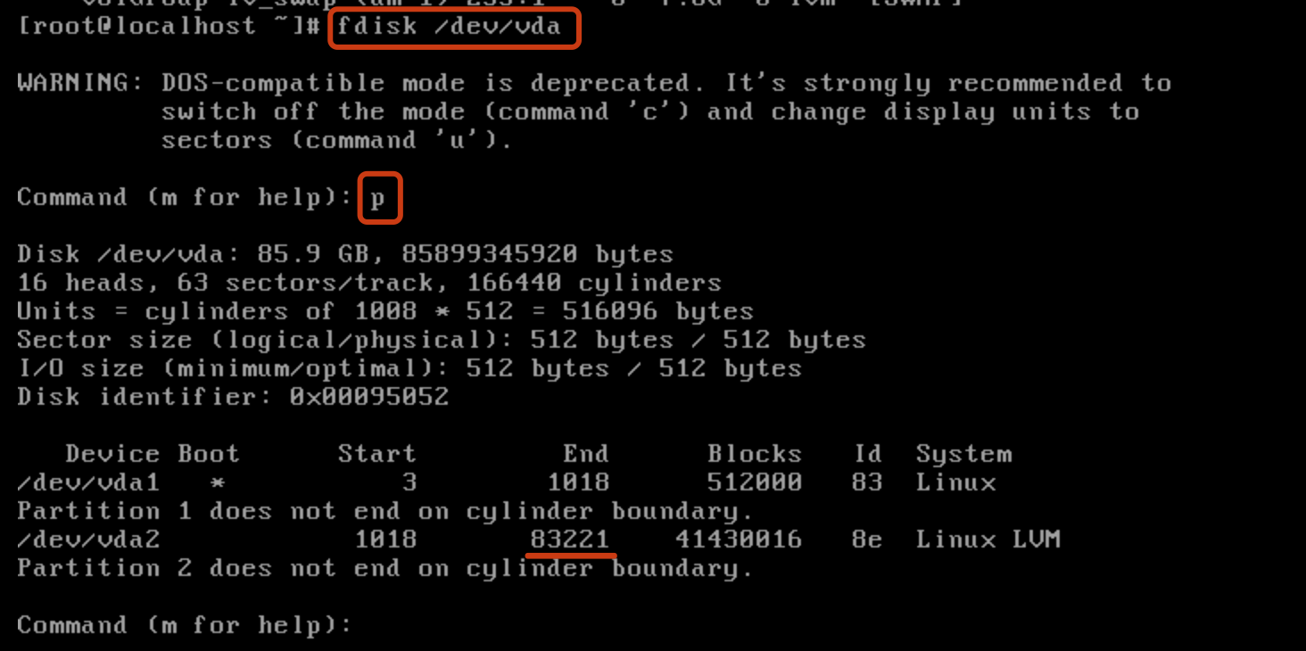 Disk partition: Enter the disk partition through "fdisk/dev/vda" and enter "p" to view the current partition. At present, the "/dev/vda" disk in the demonstration environment already has two primary partitions. Add a new partition number of 3, the new partition device name of "/dev/vda3", and the cylinder starts from 83221.