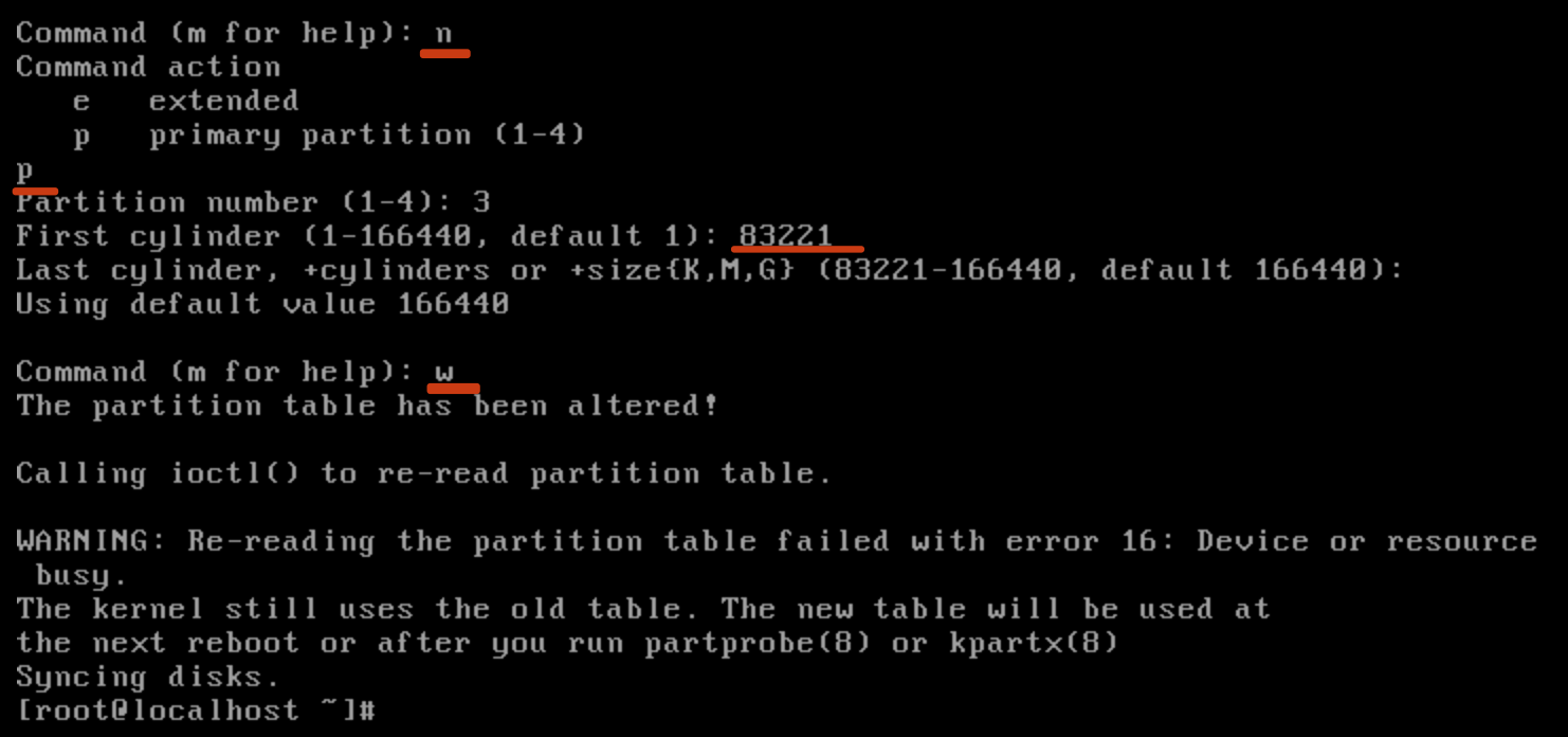 Create new partition: Enter "n" to create a new partition; Enter "p" to create a primary partition. Enter the partition number, First cylinder, Last cylinder, then enter "w" to save the partition information and exit fdisk.