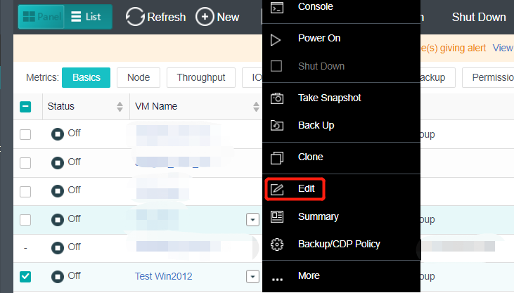 - Place the mouse over the virtual machine to be edited, and click More > Edit.