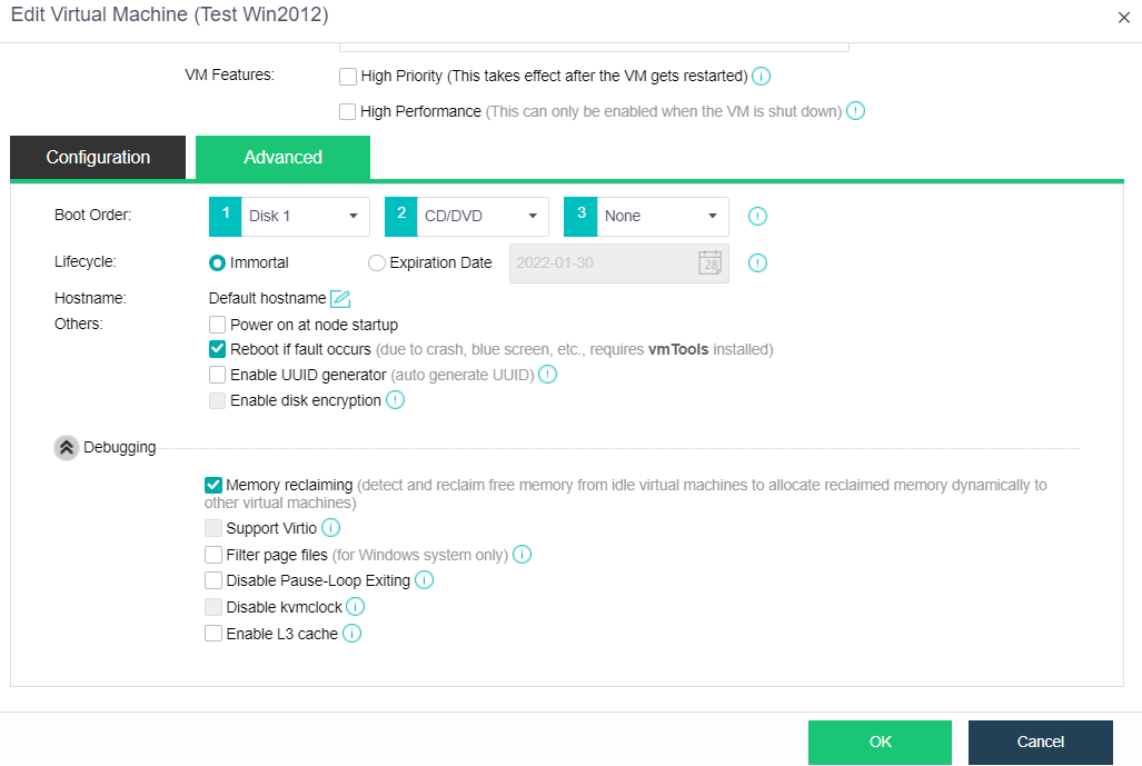 Supports editing the Advanced configurations of powered-on VMs, including Boot Order, Lifecycle, Hostname, Others, and Debugging. It is not recommended to modify Debugging by users. The following items require a VM restart to take effect: Boot Order, Enable disk encryption, Memory reclaiming, Support VirtIO, Filter page files, Disable Pause-Loop Exiting, Disable kvmclock, and Enable L3 cache.