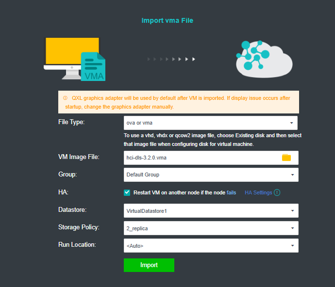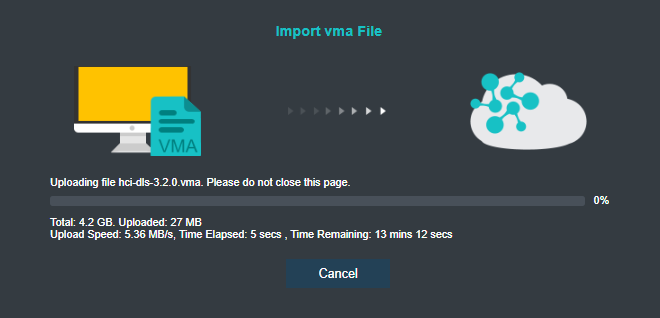 In the Import .vma File from Local System pop-up window, select the licensing server image you downloaded for VMFile, specify the group, and click Start Import.