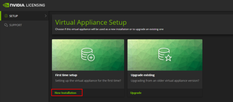 Enter the IP address (which is 10.70.0.230 in the above example) in your browser to access the licensing server. On the Virtual Appliance Setup page, click New Installation.
