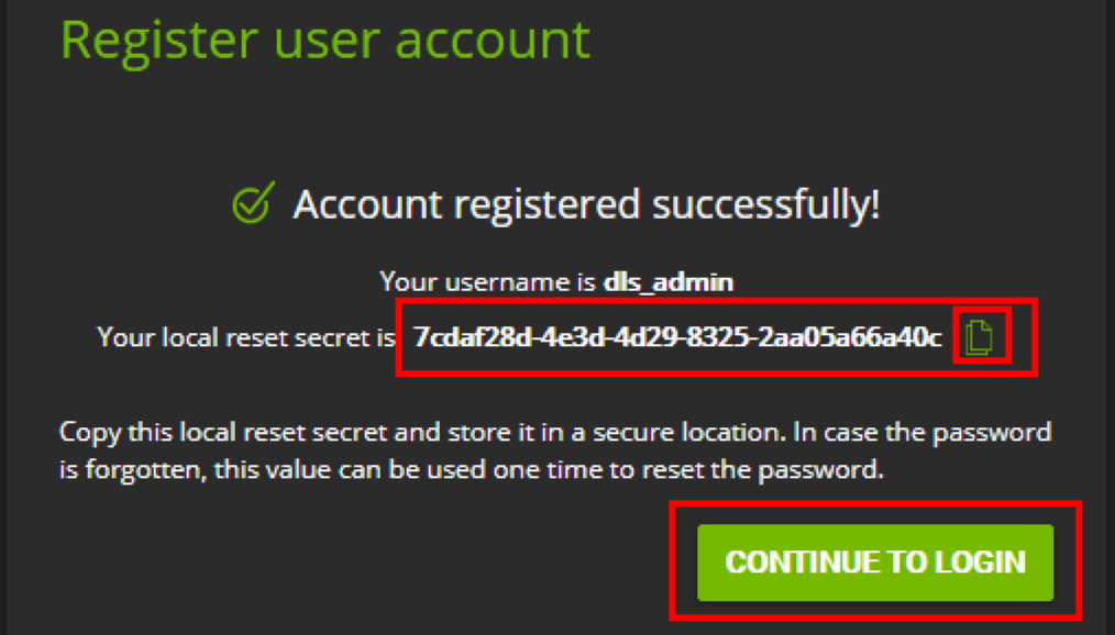 Save the string in the red box to your local system to reset your password. Click CONTINUE TO LOGIN.