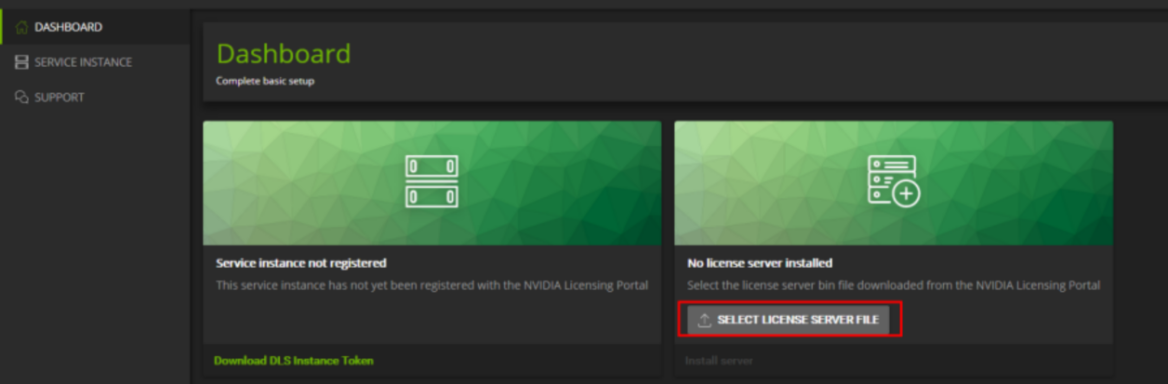 On the Dashboard page, click SELECT LICENSE SERVER FILE to upload the file.