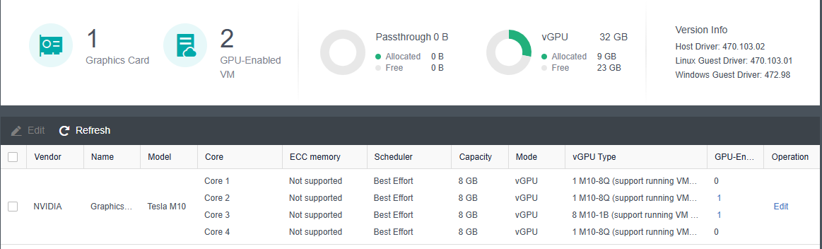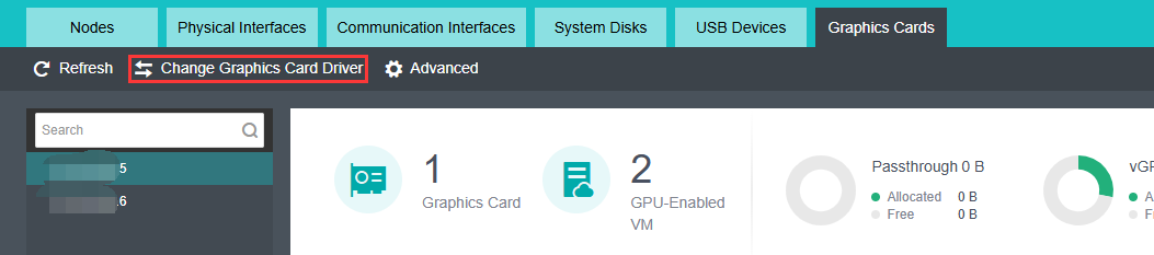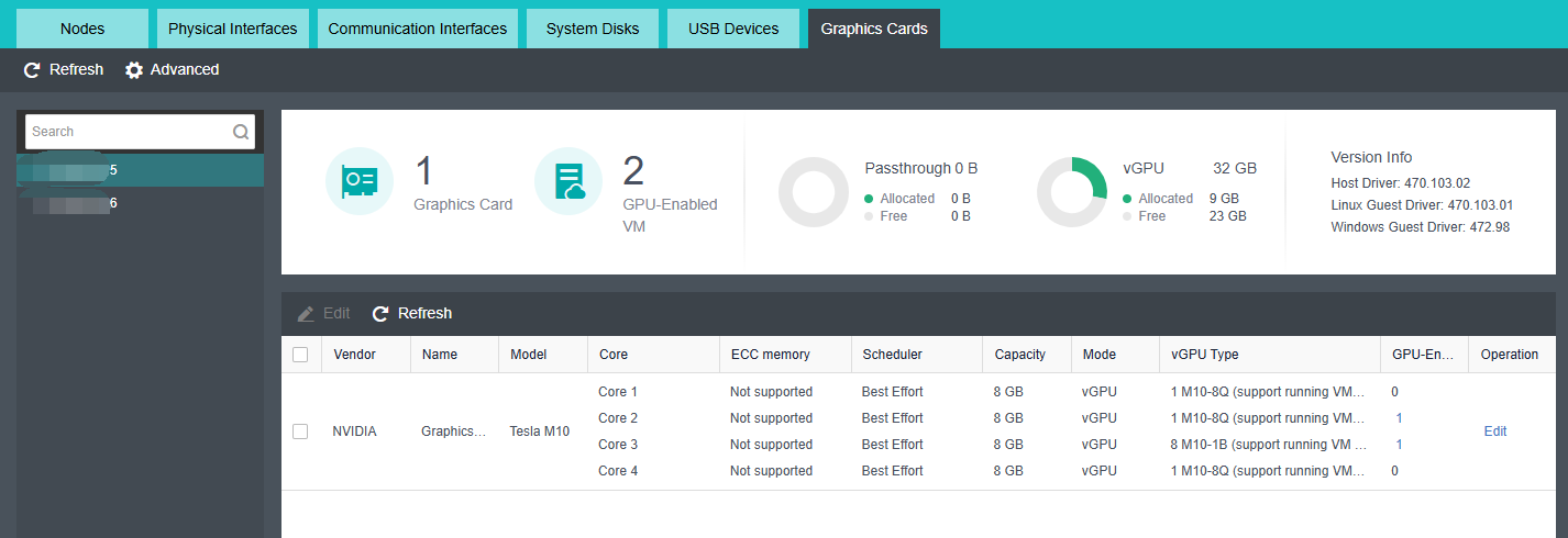 - Go to Nodes > Graphics Cards to view the realtime allocation of GPU cores and driver version information.