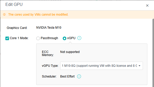 - For graphics cards supporting the passthrough mode, the passthrough mode is used by default. For graphics cards supporting vGPUs, the automatic mode is used by default, and you can select different division modes as needed.