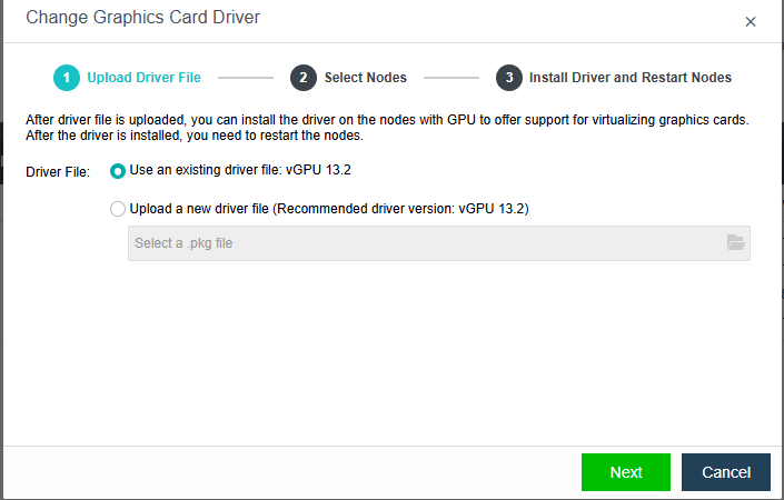 - NVIDIA vGPU Software 10.2 and 13.2 are supported. For more information about the compatible versions, visit the NVIDIA official website. If the latest HCI is installed or HCI is upgraded to 6.8.0, you need to import the GRID driver again and restart the host for the driver to take effect.