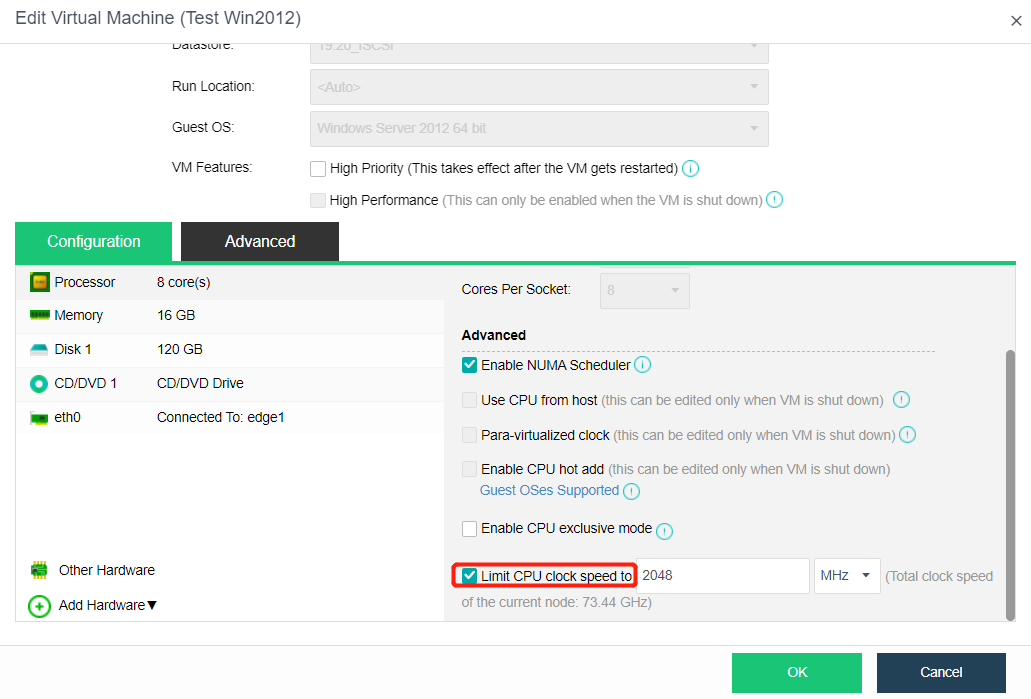 This section instructs the administrator to limit the large consumption of resources by abnormal virtual machines and ensure that other normal virtual machines have sufficient resources to use. It also supports setting in the power on state. When the virtual machine runs for one week, it will generate a recommended value and display it in the input box. The CPU frequency limit range is 100MHz-1000GHz.